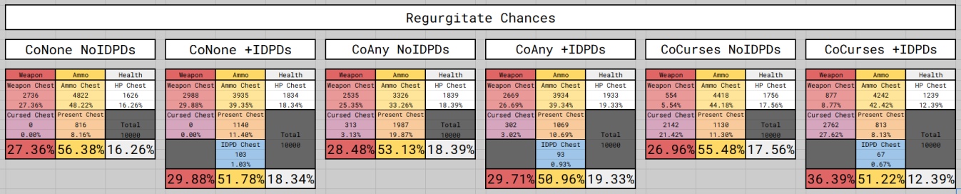 Here is a drop table for Regurgitate chances, with a 10,000 sample size for each. "CoNone" means Bare Head, "CoCurses" stands for Crown of Curses and "CoAny" for any other crown. IDPD is based on whether IDPD Chests can appear or not, based on areas.