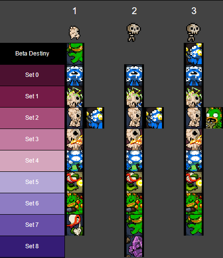 • The sets that Melting sees continues two sets after the one Skeleton left off on. If Skeleton ends on Set 7, then Set 8 is skipped, and Melting sees Sets 9-16.