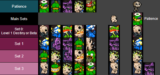 • The first level up will grant Skeleton the Patience set, and then Sets 0-6 normally.
