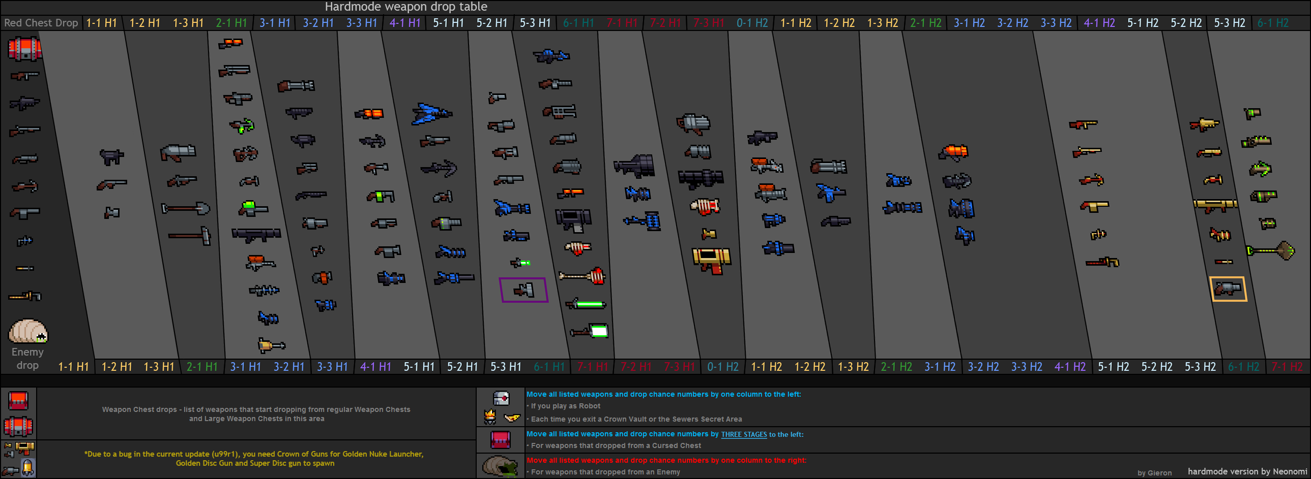 Every run in hardmode starts with a large weapon chest at the players spawn, which is one of the only upsides. Based on the weapon table in the dropdown this can pull from the first 12 weapons, while enemy drops only pull from the first 9 weapons. As Robot gives +1 difficulty, this also lets them pull from the first 16 weapons in this case.