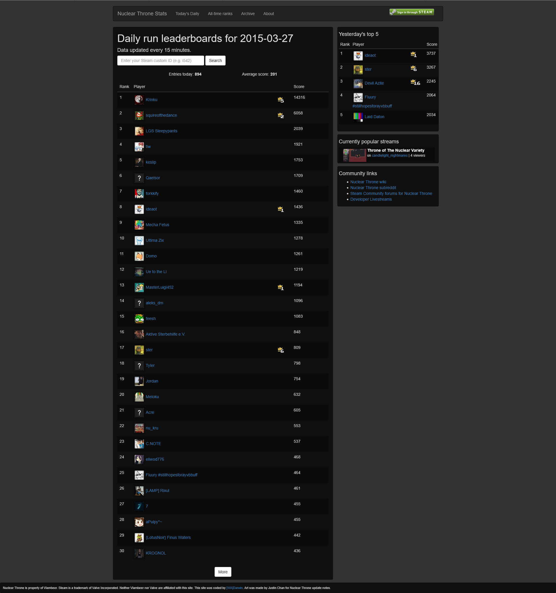 Thronebutt actively tracks Daily and Weekly leaderboards. Once a run is finished scores will be added to the website after a brief delay. Placement on these are based on kills only, not distance or any other factor. The data shown for each player is as follows: