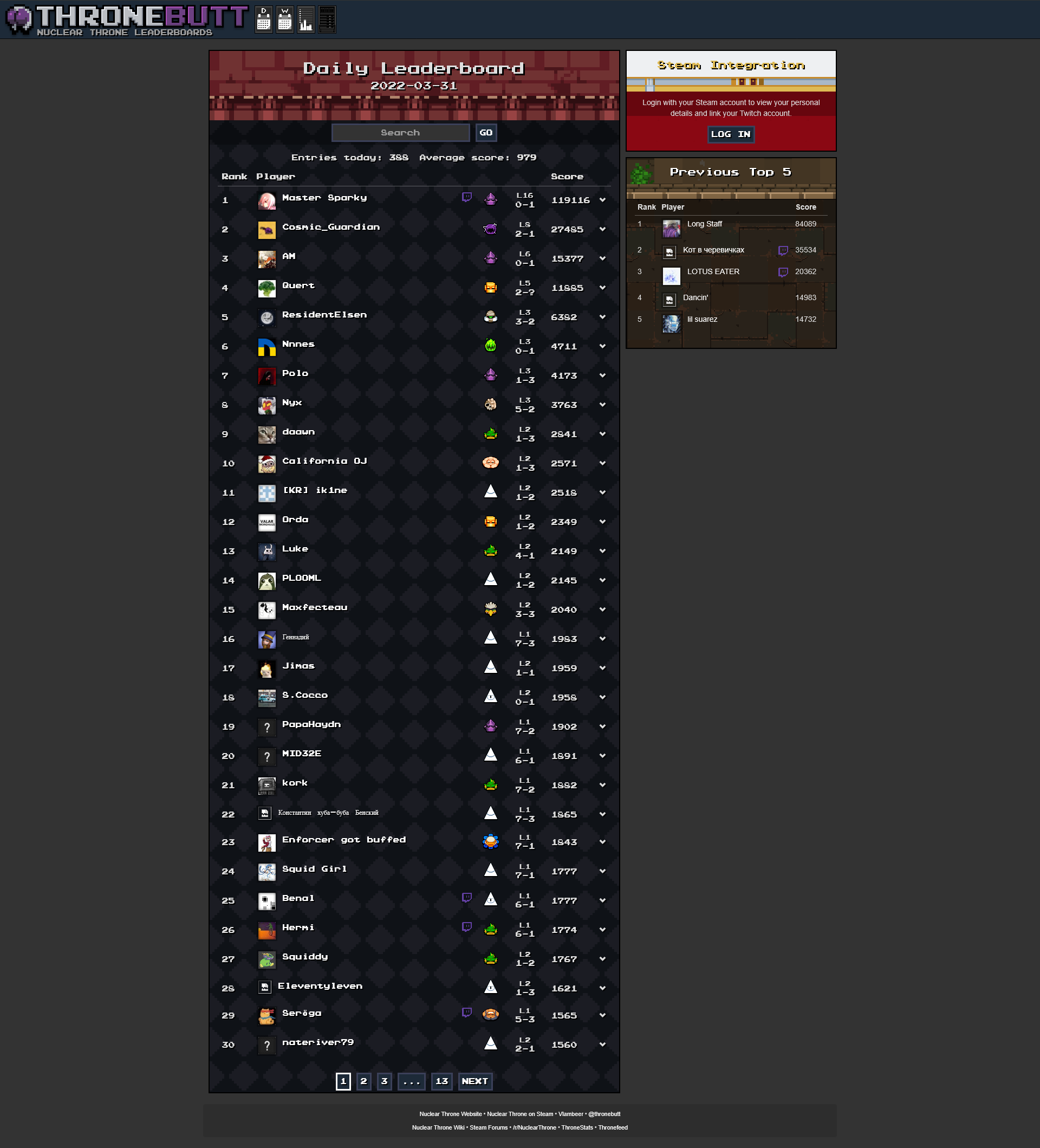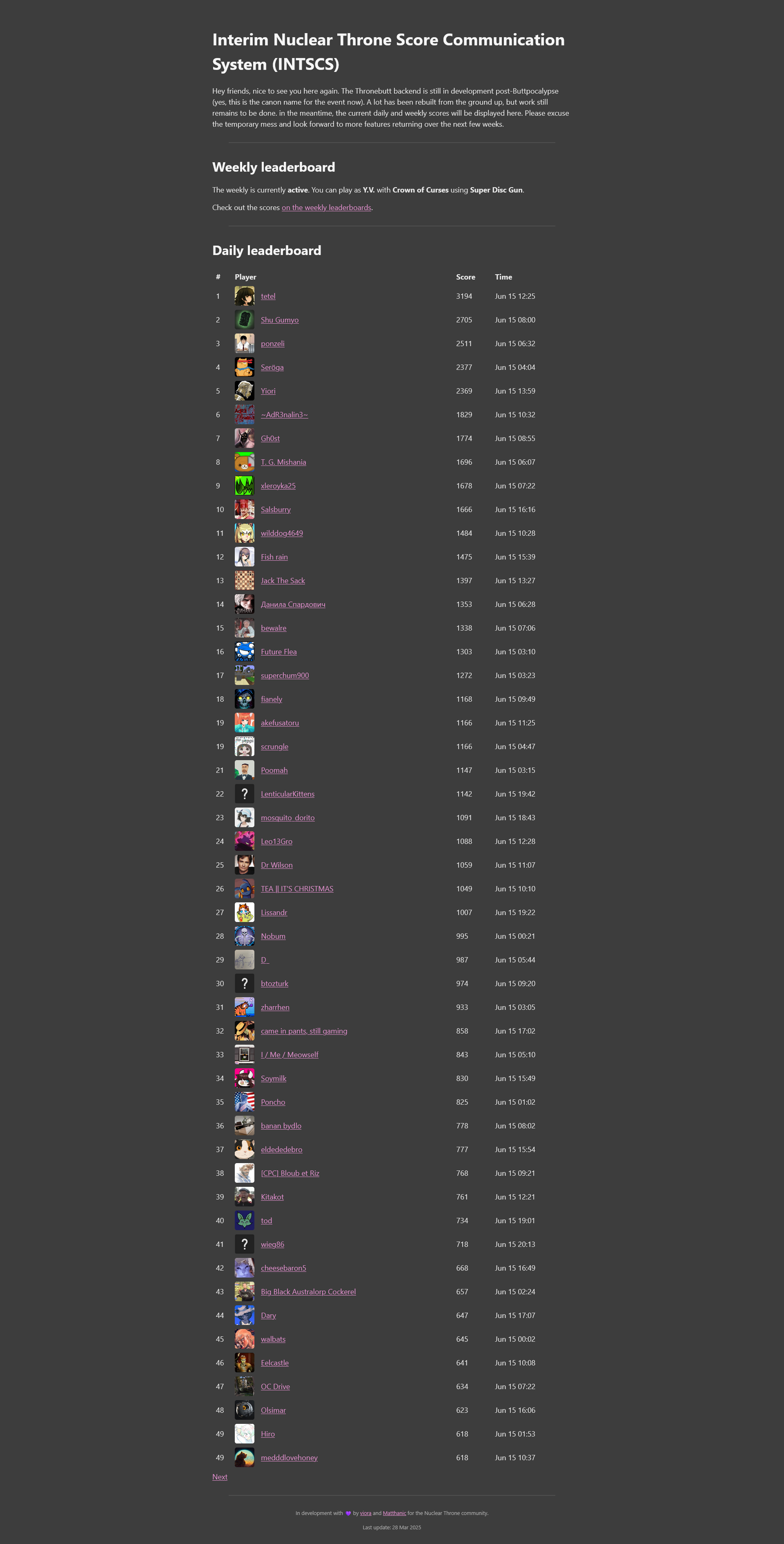 Thronebutt is a site that is used for daily/weekly leaderboard tracking, particularly for Steam. On March 25th, 2024 Thronebutt went down due to issues related to hosting now known as the 'Buttpocalypse'. Dailies returned on April 15th just a few weeks later, with Weeklies returning in early June 2024.