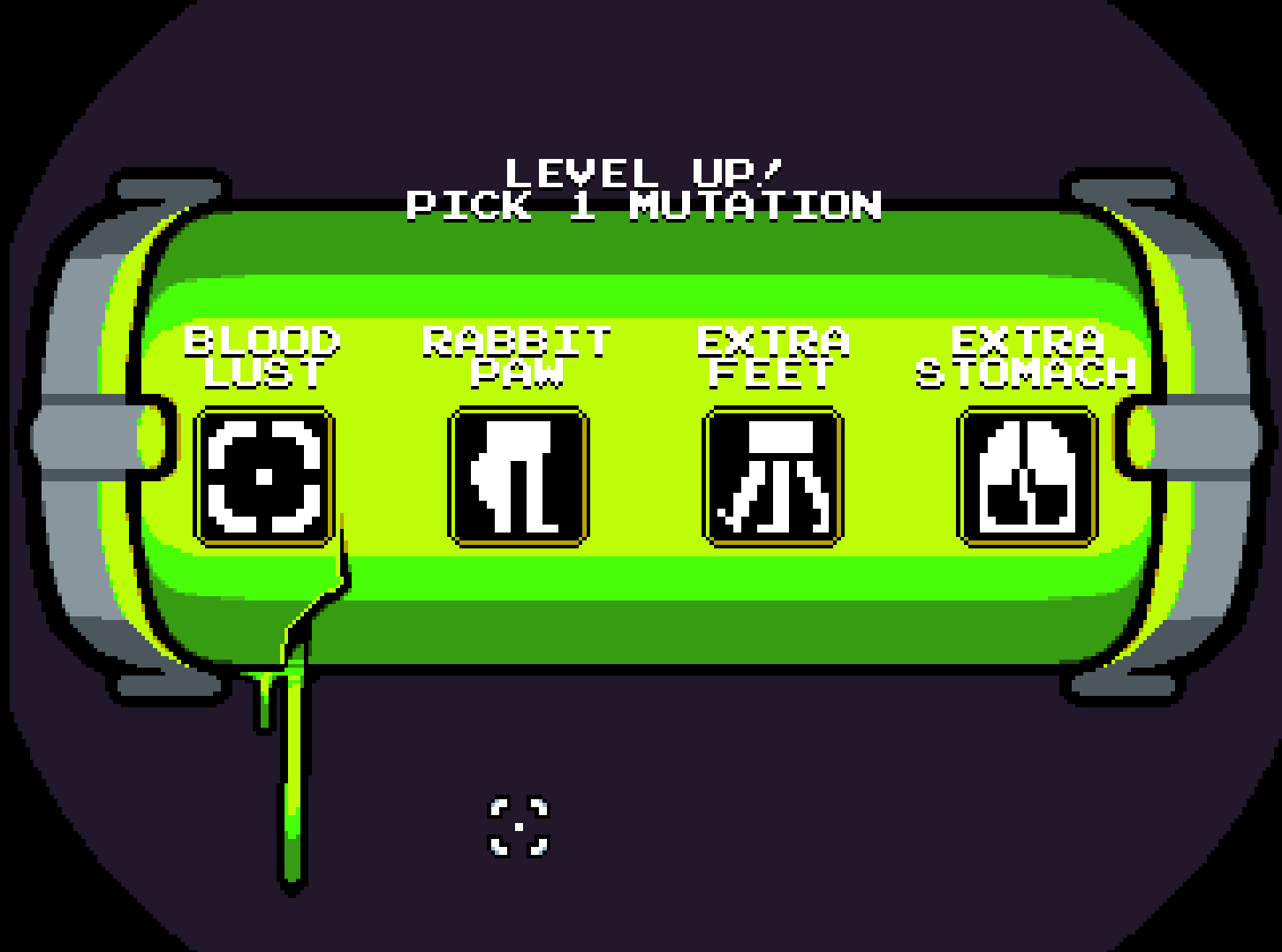a full Vlambeer title. Many weapons that appear in Nuclear Throne make their debut here including the Flamethrower, Grenade Launcher, Revolver and Minigun. The Disc Gun also appears with the unlock text "We hereby sincerely apologize." as it is a weapon that can also kill the player. It is later referenced as a NT achievement. Other unlocks that reappear in Nuclear Throne includes a Robot character and arguably a Chicken character. There is a hardmode called SFMT that gets referenced in many other Vlambeer titles, with the unlock text "Play this when the kids are in bed." |
