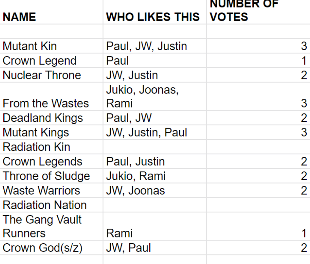 In August of 2013, Wasteland Kings was announced for entering Steam early access and was a full-time project at this point. Following this announcement Vlambeer was contacted by someone from the unrelated Wasteland 2 project regarding the similarity of the game names and how it could cause possible brand confusion, in which the decision was then made to change the game's name before the early access launch. JW later shared in a tweet in 2020 that showed possible names they were considering as a replacement.